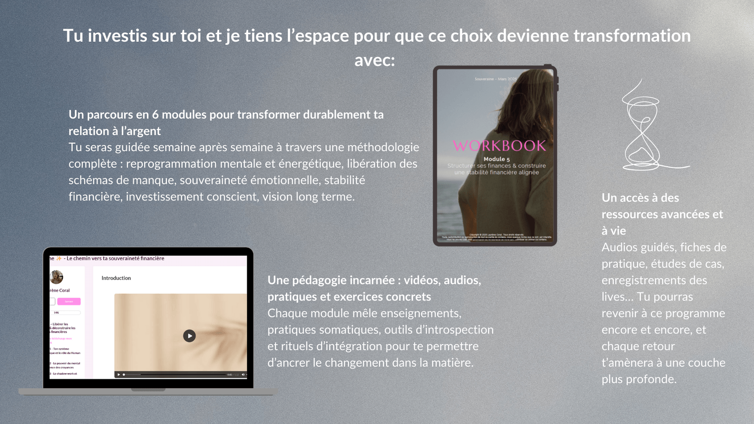 Ce n’est pas juste un cours, c’est un espace de transformation, un cocon où tu vas apprendre à accueillir pleinement ta souveraineté financière.